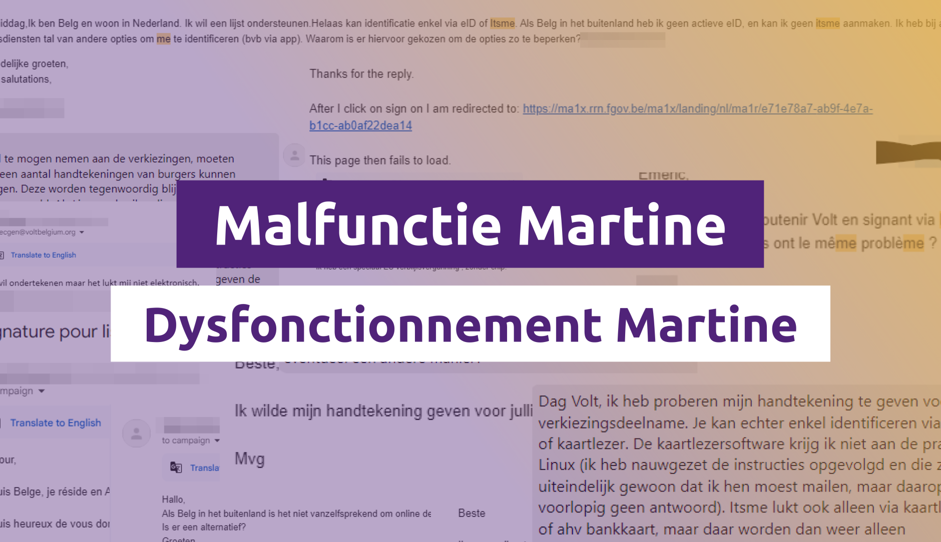 Bijna de helft van de mensen die de Volt kieslijsten willen steunen op het digitale platform 'MARTINE' van de federale overheid, blijkt af te haken. Dat is een schokkend getal. Waarom die mensen afhaken weten we niet, maar het is aannemelijk dat wie reeds heeft besloten om vanuit onze website door te klikken naar het digitale platform MARTINE, de intentie heeft om onze lijsten te ondersteunen. In een vorige klacht luidde Volt reeds de alarmbel over het groeiend aantal berichten over technische obstakels, maar Minister Verlinden ziet geen aanleiding tot actie, hoewel het slechte functioneren van MARTINE evident strijdig is met de verplichtingen die voortvloeien uit de kieswet.