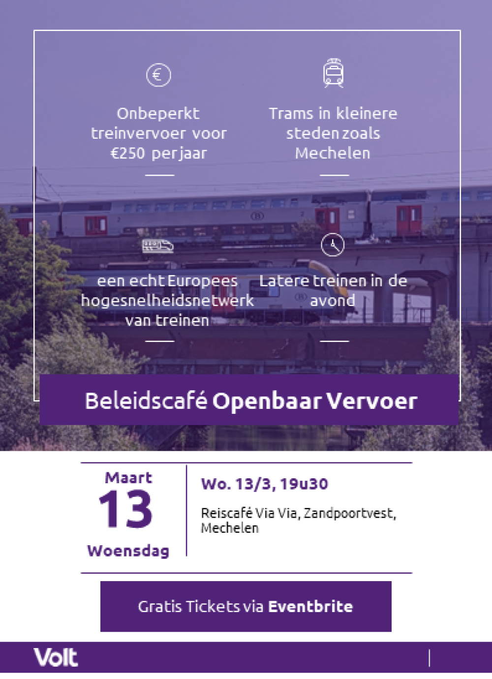 Een avond vol interessante discussies over ons openbaar vervoer, van lokaal tot Europees niveau: moet er een tram komen in Mechelen, hoe kan een Europees transportagentschap zorgen voor meer hogesnelheidstreinen, nachttreinenen en grensoverstijgend openbaar vervoer ? Wat vinden jullie van het idee van Volt België om onbeperkt treinvervoer aan te bieden voor 250 euro per jaar voor minder files, meer vrijheid en minder co2?
