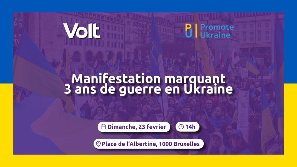 Volt Belgique participe à une manifestation pour marquer les trois ans de la guerre à grande échelle en Ukraine.