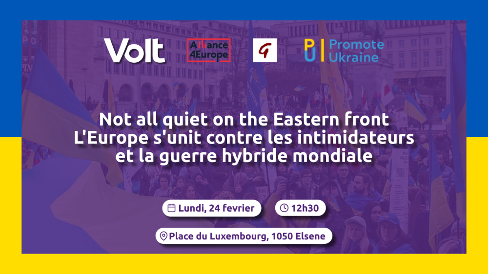 Alliance4Europe, Volt Belgique, PromoteUkraine et GRASPE vous invitent à manifester sur « notre » Place Lux, pour montrer que les fonctionnaires des institutions de l'UE — créées à l'origine pour maintenir la paix sur notre continent — ainsi que de nombreux résidents belges, se tiendront aux côtés des citoyens des voisins de la Russie victimes d'agression militaire — jusqu'à ce que tous les soldats indésirables soient de retour en Russie.