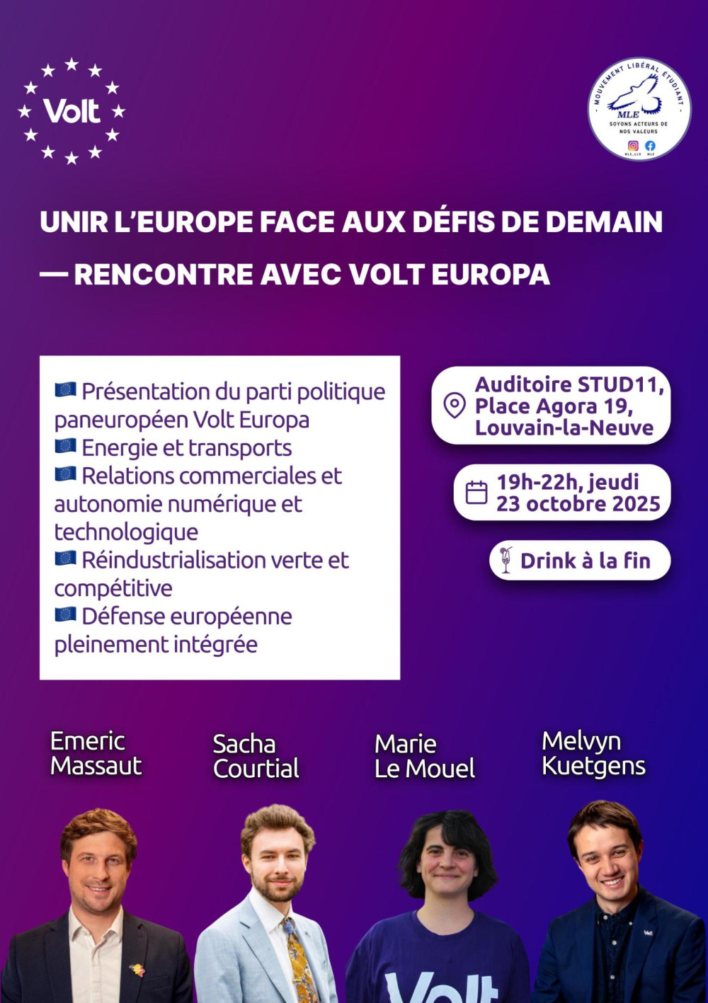 Le MLE-Mouvement libéral étudiant et Volt Belgium vous invitent à échanger avec un panel de représentants de Volt Europa, et à découvrir comment construire une Europe capable de protéger ses citoyens et d’agir sur la scène mondiale !